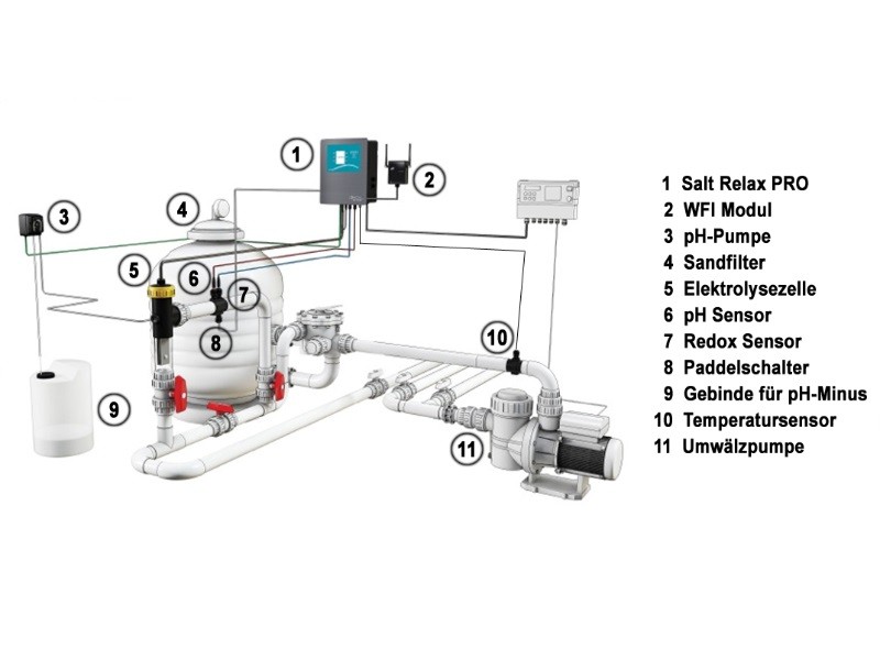 Die Salzelektrolyse in einem Pool ist ein Prozess, bei dem Salz (Natriumchlorid) ins Poolwasser gegeben wird. Ein Elektrolysegerät, das in den Wasserkreislauf integriert ist, wandelt dieses Salz durch elektrische Energie in Natrium und Chlor um. Das erzeugte Chlor wirkt als Desinfektionsmittel und hält das Wasser sauber und frei von Keimen. Nach der Desinfektion verbindet sich das Chlor wieder mit Natrium zu Salz, wodurch ein Kreislauf entsteht.